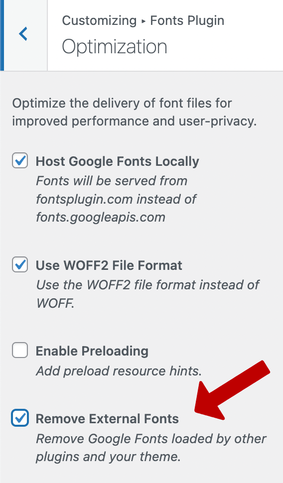 To remove Google Fonts with Fonts Plugin Pro, navigate to wp-admin → Customize → Fonts Plugin → Optimization.