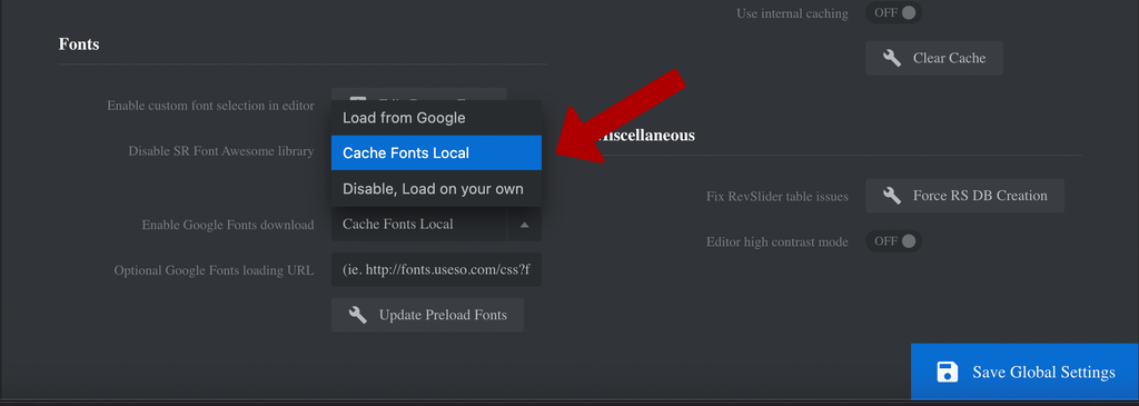 Click ‘Global’ and then under the ‘Fonts’ section, change the ‘Enable Google Fonts download’ setting to either ‘Cache Fonts Local’ or ‘Disable, Load on your own.